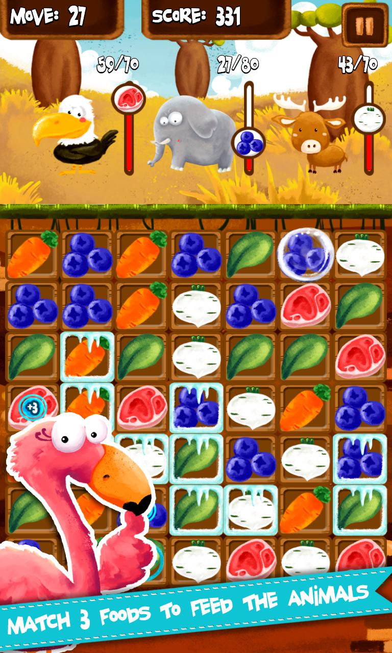 動物園動物餓了。從A區到Z區域探索動物園。通過連續或色譜柱匹配3種食物來餵食它們。繼續餵食它們,直到動物飽滿,然後移動或時鐘耗盡。
